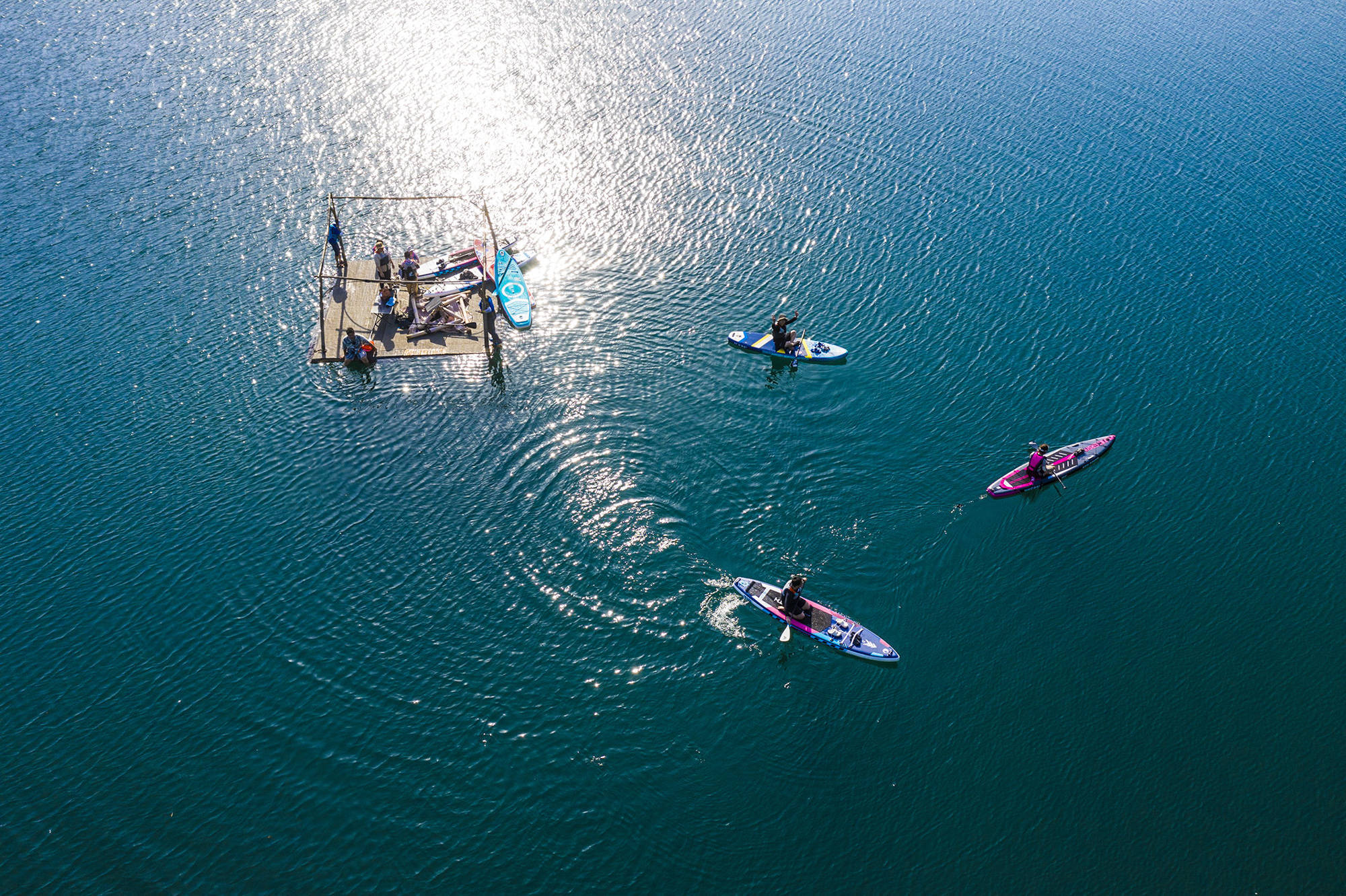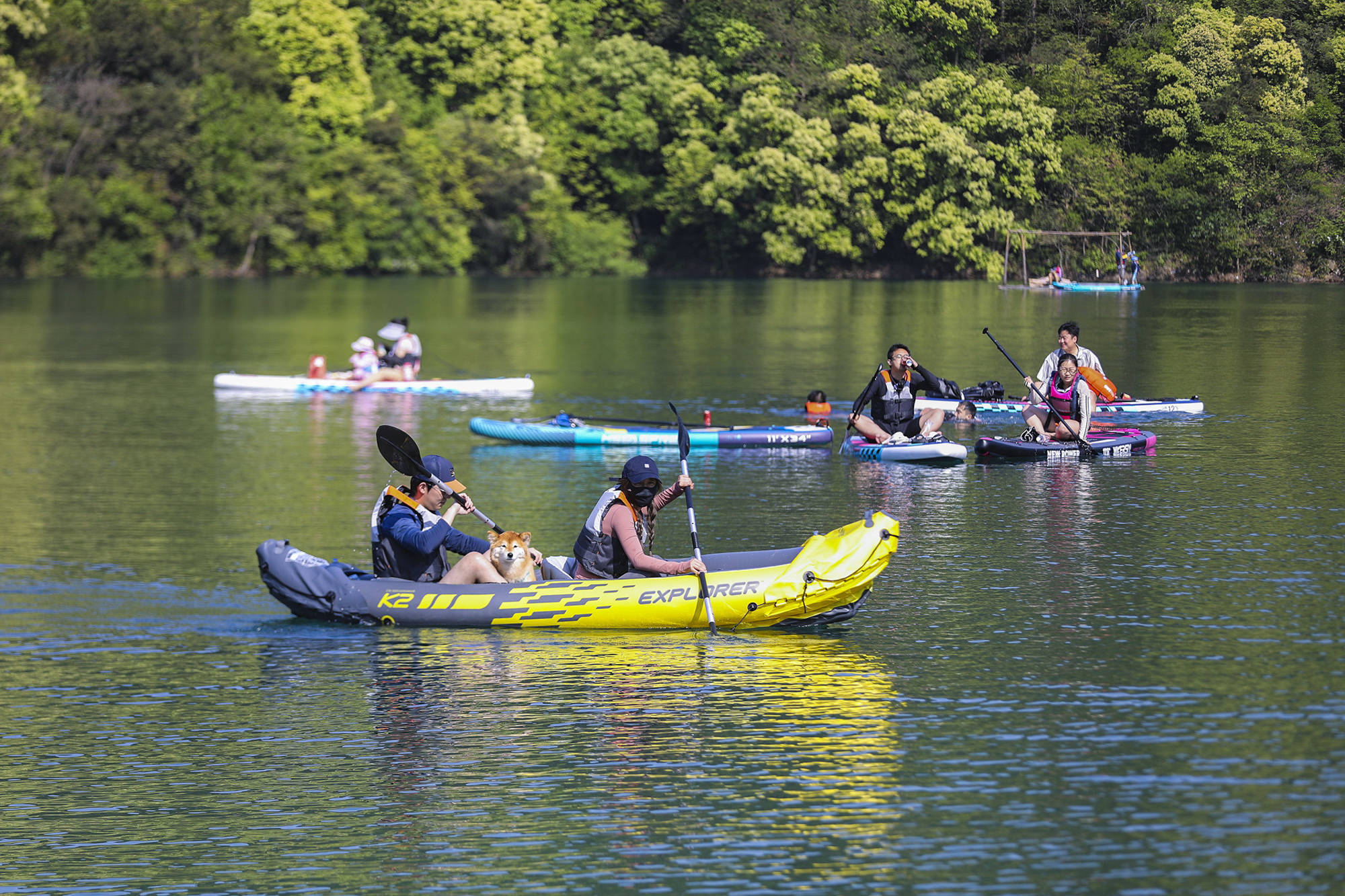 ↑2026年4月26日,浙江省湖州市长兴县龙山街道桃花岕森林公园,游客在划桨板和皮划艇。(无人机照片)CICPHOTO/邹黎 摄