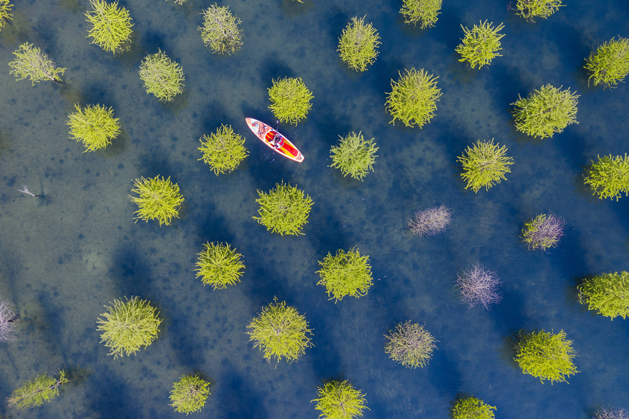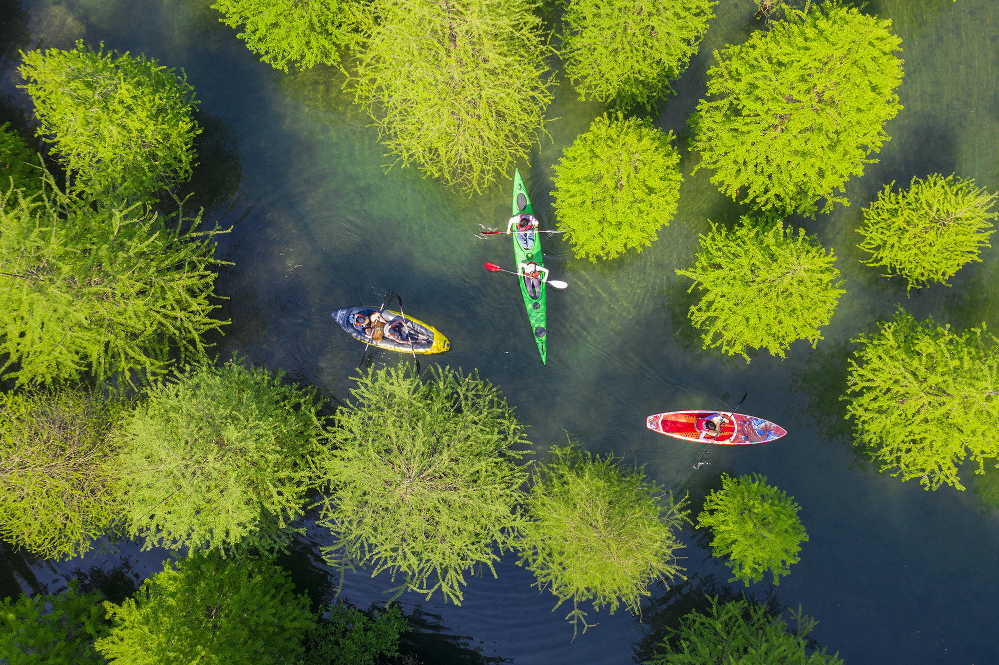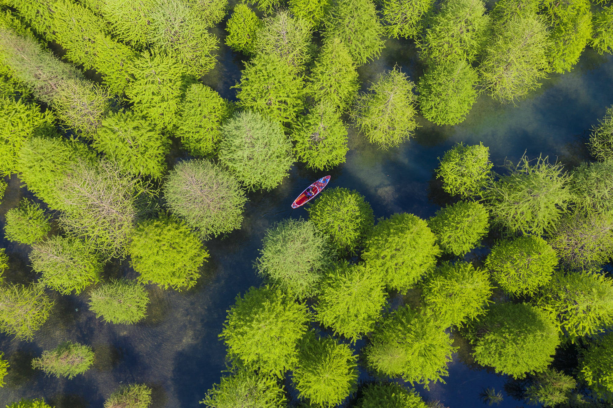 ↑2026年4月26日,浙江省湖州市长兴县龙山街道桃花岕森林公园,游客划着皮划艇在水杉林间穿行。(无人机照片)CICPHOTO/邹黎 摄