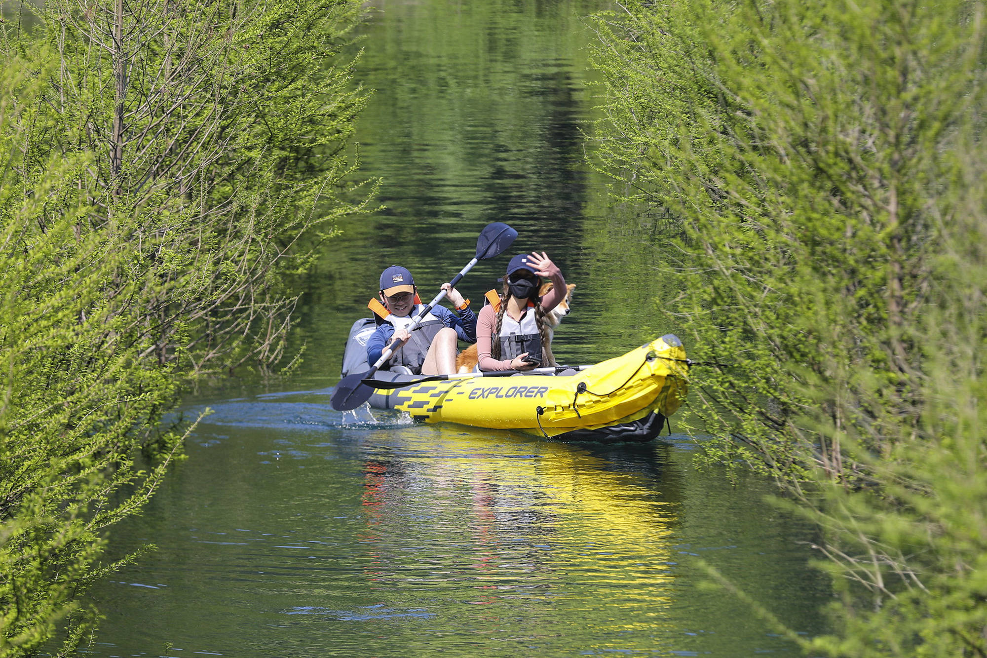 ↑2026年4月26日,浙江省湖州市长兴县龙山街道桃花岕森林公园,游客划着皮划艇在水杉林间穿行。CICPHOTO/邹黎 摄
